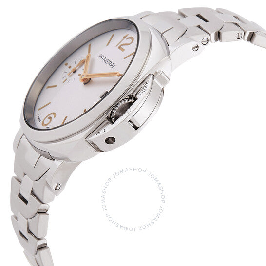Silver-tone stainless steel case and bracelet. Fixed silver-tone stainless steel bezel. White dial with rose gold-tone hands and index hour markers. Dial Type: Analog. Luminescent hands and markers. Date display at the 3 o'clock position. One subdial displaying: small second. Panerai Calibre P.900 Automatic movement, based upon Panerai OP XXXIV, containing 25 Jewels, bitting at 28800 vph, and has a power reserve of approximately 72 hours. Scratch resistant sapphire crystal. Cushion case shape, case size: 38 mm. Fold over clasp with a safety release. Water resistant at 50 meters / 165 feet. Functions: date, hour, minute, small second. Luminor Due Series. Luxury watch style. Watch label: Swiss Made. Panerai Luminor Due Automatic White Dial Men's Watch PAM01508.