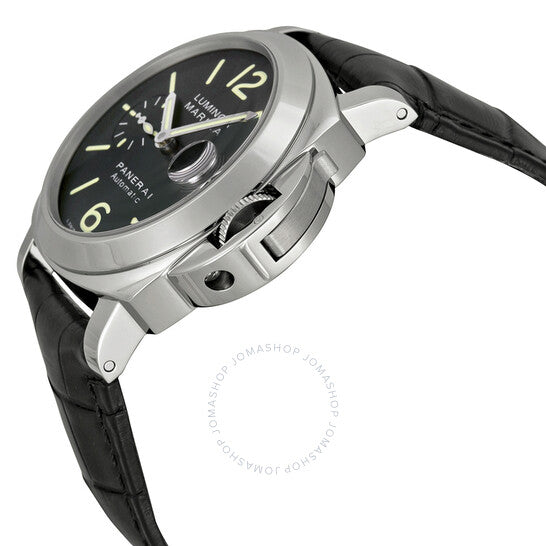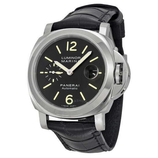Silver-tone stainless steel case with a black alligator leather strap. Fixed silver-tone stainless steel bezel. Black dial with luminous hands and index hour markers. Arabic numerals mark the 6 and 12 o'clock positions. Dial Type: Analog. Luminescent hands and dial markers. Date display at the 3 o'clock position. Seconds at the 9 o'clock position subdials. Panerai Calibre OP III Automatic movement, based upon 7750-P1, containing 21 Jewels, bitting at 28800 vph, and has a power reserve of approximately 42 hours. Scratch resistant glareproof sapphire crystal. Screw down crown. Stainless steel with 'officine panerai' engraved case back. Cushion case shape, case size: 44 mm, case thickness: 15.5 mm. Band width: 24.3 mm, band length: 9 inches. Deployment clasp. Water resistant at 300 meters / 1000 feet. Functions: date, hour, minute, small second, chronometer. Additional Info: pam104. Dive watch style. Watch label: Swiss Made. Panerai Luminor Marina Automatic Men's Watch PAM00104.