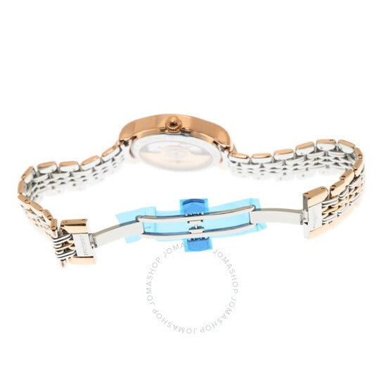 Rose gold-tone stainless steel case with a two-tone (silver-tone and rose gold-tone) stainless steel bracelet. Fixed rose gold-tone stainless steel bezel. White dial with rose gold-tone hands and Roman numeral hour markers. Minute markers around the outer rim. Dial Type: Analog. Date display at the 3 o'clock position. Automatic movement. Scratch resistant sapphire crystal. Transparent see through case back. Round case shape, case size: 30 mm. Deployment with push button release clasp. Functions: date, hour, minute, second. Additional Info: original box, international warranty card, manual (complete accessories). Lyre Series. Luxury watch style. Watch label: Swiss Made. Longines Lyre Automatic White Dial Ladies Watch L43611117.