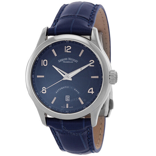 Silver-tone stainless steel case with a blue leather strap. Fixed silver-tone stainless steel bezel. Blue dial with silver-tone hands and index-Arabic numeral hour markers. Minute markers around the outer rim. Dial Type: Analog. Date display at the 3 o'clock position. ETA Caliber 2824-2 Automatic movement, based upon ETA 2824, containing 25 Jewels, bitting at 28800 vph, and has a power reserve of approximately 38 hours. Scratch resistant sapphire crystal. Solid case back. Round case shape, case size: 42 mm. Band width: 22 mm. Deployment buckle clasp. Water resistant at 100 meters / 330 feet. Functions: date, hour, minute, second. M02-4 Series. Sport watch style. Watch label: Swiss Made. Armand Nicolet M02-4 Automatic Blue Dial Men's Watch A840AAA-BU-P840BU2.