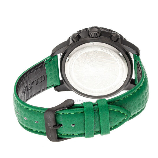 Black-plated stainless steel case with a green leather strap. Uni-directional rotating black-plated bezel with green carbon fiber inlay. Black carbon fiber dial with luminous silver-tone hands and index hour markers. Arabic numeral appears at the 12 o'clock position. Minute markers around the outer rim. Dial Type: Analog. Luminescent hands. Date display at the 4 o'clock position. Chronograph - three sub-dials displaying: 60 second, 30 minute and 24 hour. Quartz movement. Scratch resistant mineral crystal. Solid case back. Round case shape. Case size: 45 mm. Case thickness: 14 mm. Band width: 22 mm. Tang clasp. Water resistant at 100 meters / 330 feet. Functions: chronograph, date, hour, minute, second. M51 Series Series. Sport watch style. Item Variations: MPH5105. Morphic M51 Series Chronograph Black Dial Men's Watch 5105.