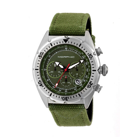 Silver-tone stainless steel case with a olive leather strap. Uni-directional rotating silver-tone bezel. Olive dial with black hands and Arabic numeral hour markers. Tachymeter scale around the outer rim. Dial Type: Analog. Luminescent hands and markers. Date display between 4 and 5 o'clock position. Chronograph - three sub-dials displaying: 60 second, 30 minute and 24 hour. Quartz movement. Scratch resistant mineral crystal. Round case shape, case size: 45 mm, case thickness: 12 mm. Band width: 24 mm. Buckle clasp. Water resistant at 50 meters / 165 feet. Functions: chronograph, date, GMT, second time zone, hour, minute, second. Sport watch style. Watch label: Japan Movt. Item Variations: MPH5302. Morphic M53 Series Chronograph Men's Watch 5302.