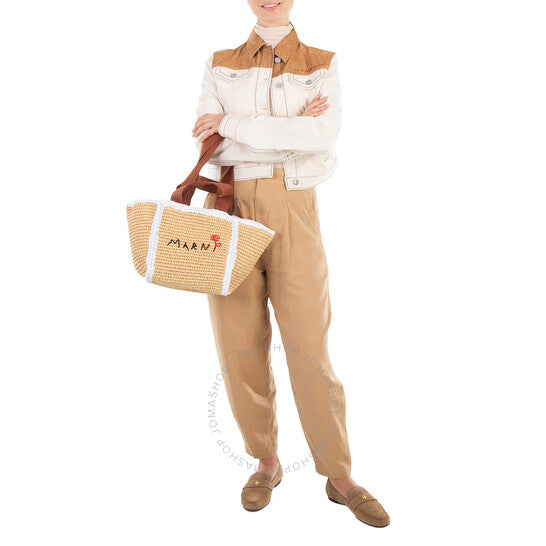 Marni Ladies Tote. SKU: SHMP0121L0-NATURAL/WHITE/RUST. Color: Natural/White/Rust. Size: 8.6 x 8.6 x 5.1". Marni Macrame Sillo Small Woven Shopper Tote Bag. This small macrame Sillo shopper is woven from raffia-effect yarn, featuring a gusset construction, double tape handles, and a hand-stitched Marni mending logo with a flower detail on the front. 100% Viscose-Rayon.