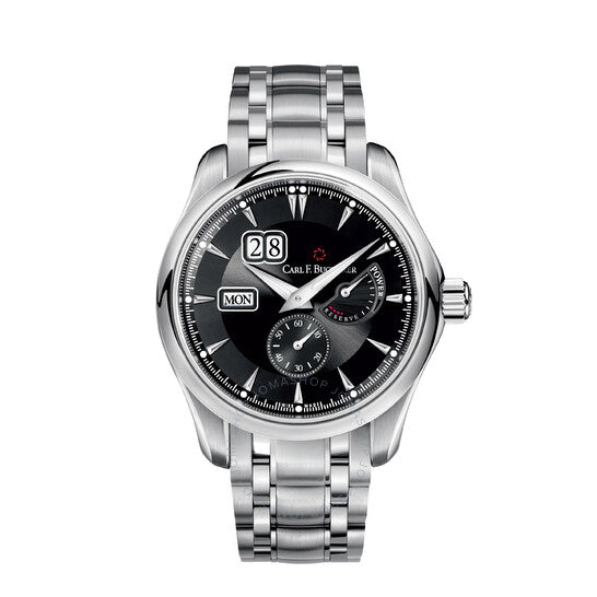 Silver-tone stainless steel case with a silver-tone stainless steel bracelet. Fixed silver-tone stainless steel bezel. Black dial with silver-tone dauphine-style shape hands and index hour markers. Minute markers around the outer rim. Dial Type: Analog. Date display at the 9 o'clock position. Two- 60 seconds, power reserve subdials. Carl F. Bucherer Calibre CFB A1011 Automatic movement, containing 33 Jewels, bitting at 21600 vph, and has a power reserve of approximately 55 hours. Scratch resistant sapphire crystal. Skeleton transparent exhibition see through case back. Round case shape, case size: 42.5 mm, case thickness: 12.54 mm. Water resistant at 30 meters / 100 feet. Functions: big date, day, hour, minute, small second, power reserve indicator. Manero Series. Luxury watch style. Watch label: Swiss Made. Item Variations: 166.281.7. Carl F. Bucherer Manero Automatic Men's Watch 00.10912.08.33.21.