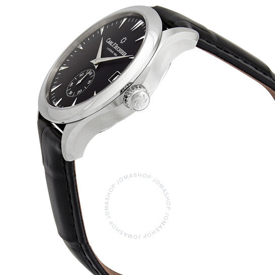 Stainless steel case with a black (alligator) leather strap. Fixed stainless steel bezel. Black dial with silver-tone hands and index hour markers. Minute markers around the outer rim. Dial Type: Analog. Date display at the 3 o'clock position. Small seconds sub-dial. Caliber A2050 automatic movement with a 55-hour power reserve. Scratch resistant sapphire crystal. Transparent case back. Round case shape. Case size: 40.6 mm. Case thickness: 11.2 mm. Band width: 20 mm. Fold over clasp. Water resistant at 30 meters / 100 feet. Functions: date, hour, minute. Manero Peripheral Series. Luxury watch style. Watch label: Swiss Made. Carl F. Bucherer Manero Peripheral Automatic Black Dial Watch 00.10917.08.33.01.