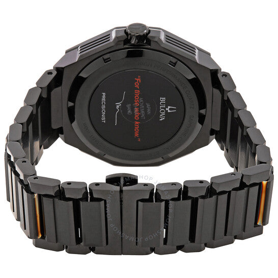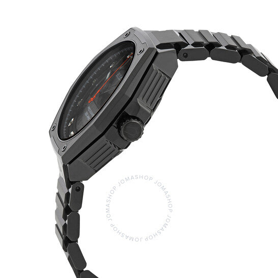 Black stainless steel case and bracelet. Fixed black stainless steel bezel. Black dial with black hands and diamond-index hour markers. Minute markers around the outer rim. Dial Type: Analog. Luminescent hands and markers. Date display at the 3 o'clock position. Quartz movement. Scratch resistant sapphire crystal. Solid case back. Round case shape, case size: 48.5. Deployant with push buttons clasp. Water resistant at 100 meters / 330 feet. Functions: date, hour, minute, second. Marc Anthony Series. Dress watch style. Bulova Marc Anthony Quartz Diamond Black Dial Men's Watch 98D183.