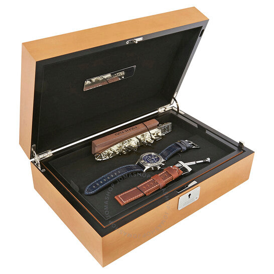 Stainless steel case with a blue (alligator) leather strap. Fixed stainless steel bezel showing tachymeter markings. Blue dial with luminous blue hands and index hour markers. Arabic numerals mark the 6 and 12 o'clock positions. minute markers around an inner ring. Dial Type: Analog. Luminescent hands and markers. Chronograph - two sub-dials displaying: 60 second and 30 minute. Panerai calibre OP XXXIII hand wind movement with a 42-hour power reserve. Scratch resistant sapphire crystal. Pull / push crown. Solid case back. Cushion case shape. Case size: 42 mm. Band width: 22 mm / 22 mm. Tang clasp. Water resistant at 50 meters / 165 feet. Functions: chronograph, tachymeter, hour, minute, second. Additional Info: limited edition of 1000 pieces. Luxury watch style. Watch label: Swiss Made. Panerai Mare Nostrum Acciaio Chronograph Blue Dial Men's Watch PAM00716.