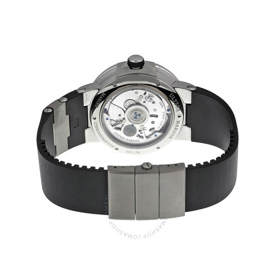 Silver-tone stainless steel case with a black rubber strap with titanium elements strap. Fixed silver-tone stainless steel bezel. Black dial with luminous skeleton hands and Roman numeral hour markers. Minute markers around the outer rim. Dial Type: Analog. Luminescent hands and markers. Date display at the 6 o'clock position. Seconds sub-dial at the 6 o'clock position subdials. Ulysse Nardin Calibre UN-118 Automatic movement, based upon Ulysse Nardin UN-66, containing 50 Jewels, bitting at 28800 vph, and has a power reserve of approximately 60 hours. Scratch resistant sapphire crystal. Screw down crown. Transparent case back. Round case shape, case size: 45 mm, case thickness: 14 mm. Band width: 24 mm, band length: 8 inches. Fold over with safety release clasp. Water resistant at 200 meters / 660 feet. Functions: date, hour, minute, second, power reserve indicator, chronometer. Luxury watch style. Watch label: Swiss Made. Ulysse Nardin Marine Chronometer Automatic Men's Watch 183-122-3-42.