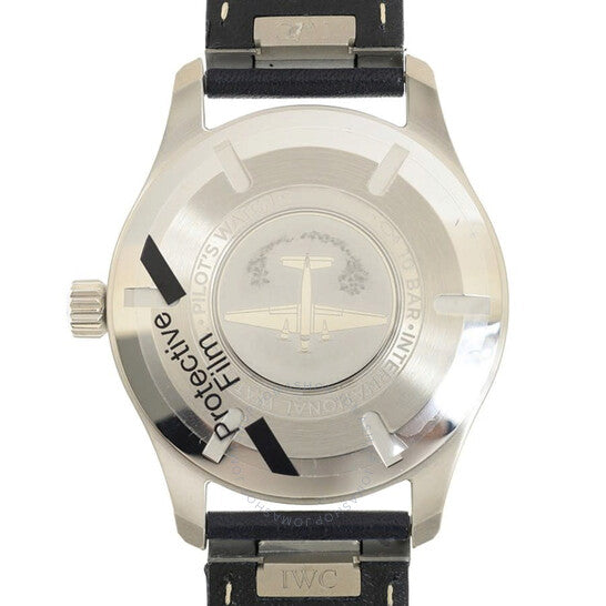 Silver-tone stainless steel case with a blue leather strap. Fixed silver-tone stainless steel bezel. Blue dial with silver-tone hands and Arabic numeral hour markers. Minute markers around the outer rim. Dial Type: Analog. Luminescent hands and markers. Date display at the 3 o'clock position. Automatic movement. Scratch resistant sapphire crystal. Screw down crown. Solid case back. Round case shape, case size: 40 mm, case thickness: 10.8 mm. Band width: 20 mm. Buckle clasp. Water resistant at 100 meters / 330 feet. Functions: date, hour, minute, second. Additional Info: original box, manual (complete accessories). Pilots Series. Luxury watch style. Watch label: Swiss Made. IWC Pilots Automatic Blue Dial Men's Watch IW328203.