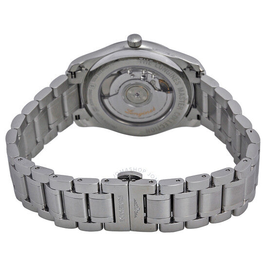 Silver-tone stainless steel case with a silver-tone stainless steel bracelet. Fixed domed silver-tone stainless steel bezel. Black dial with silver-tone hands and Roman numeral hour markers. Minute markers around the outer rim. Dial Type: Analog. Date display at the 3 o'clock position. Longines Calibre L619/888 Automatic movement, based upon ETA 2892, containing 21 Jewels, bitting at 25200 vph, and has a power reserve of approximately 64 hours. Scratch resistant sapphire crystal. Pull / push crown. Skeleton case back. Round case shape, case size: 40 mm. Deployment clasp. Water resistant at 30 meters / 100 feet. Functions: date, hour, minute, second. Master Series. Dress watch style. Watch label: Swiss Made. Longines Master Automatic Black Dial Men's Watch L27934516.