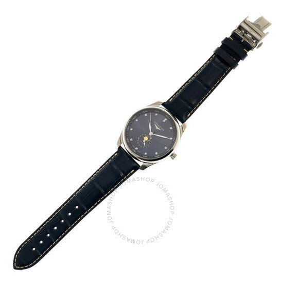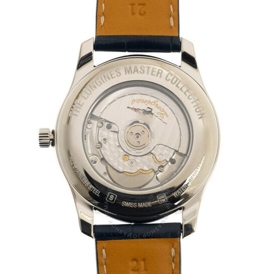 Silver-tone stainless steel case with a blue alligator band. Fixed silver-tone stainless steel bezel. Blue dial with silver-tone hands and diamond hour markers. Minute markers around the outer rim. Dial Type: Analog. Date display at the 6 o'clock position. Automatic movement. Scratch resistant sapphire crystal. Transparent see through case back. Round case shape, case size: 42 mm. Deployment with push button release clasp. Water resistant at 30 meters / 100 feet. Functions: date, hour, minute, second. Additional Info: original box, international warranty card, manual (complete accessories). Master Series. Luxury watch style. Watch label: Swiss Made. Longines Master Automatic Diamond Blue Dial Men's Watch L2.919.4.97.0.