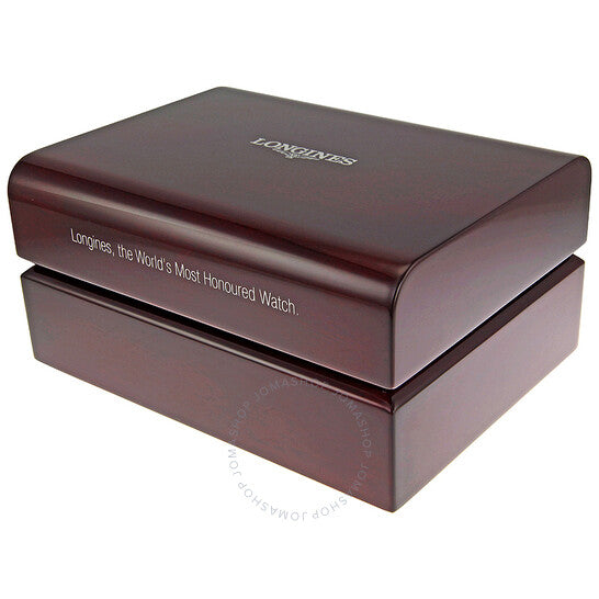 Stainless steel case with a brown leather strap. Fixed stainless steel bezel. Silver dial with blue leaf-style hands and black Arabic numeral hour markers. Minute markers around the outer rim. Dial Type: Analog. Date display between the 4 and 5 o'clock positions. Chronograph - three sub-dials displaying: 60 second, 30 minute and 12 hour. Longines calibre L688 automatic movement, based upon ETA A08.L01, containing 27 Jewels, bitting at 28800 vph, and has a power reserve of approximately 54 hours. Scratch resistant sapphire crystal. Pull / push crown. Skeleton case back. Round case shape. Case size: 42 mm. Case thickness: 16 mm. Band width: 21 mm. Deployment clasp with a push button release. Water resistant at 30 meters / 100 feet. Functions: chronograph, column wheel, date, hour, minute, small second. Master Collection Series. Casual watch style. Watch label: Swiss Made. Longines Master Chronograph Automatic Silver Dial Men's Watch L27594783.