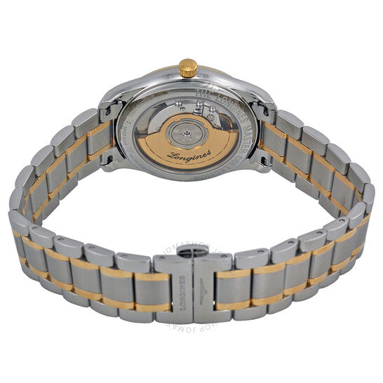 Silver-tone stainless steel case with a two-tone (silver-tone and yellow gold-tone) stainless steel with 18kt yellow gold bracelet. Fixed yellow gold-tone 18kt yellow gold bezel. White dial with yellow gold-tone hands and stick hour markers. Minute markers around the outer rim. Dial Type: Analog. Date display at the 3 o'clock position. Longines Calibre L619 Automatic movement, based upon ETA 2892-A2, containing 21 Jewels, bitting at 28800 vph, and has a power reserve of approximately 42 hours. Scratch resistant sapphire crystal. Skeleton case back. Round case shape, case size: 36 mm. Deployment with push button release clasp. Water resistant at 30 meters / 100 feet. Functions: date, hour, minute, second. Master Collection Series. Dress watch style. Watch label: Swiss Made. Item Variations: L2 518 5 12 7, L2-518-5-12-7, L2/518/5/12/7, L25185127. Longines Master Collection Automatic White Dial Men's Watch L2.518.5.12.7.