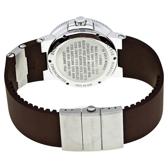 Stainless steel case with a brown rubber strap with titanium inserts. Fixed stainless steel bezel. Brown dial with silver-tone hands and Arabic numeral hour markers. Minute markers around the outer rim. Dial Type: Analog. Luminescent hands and markers. Date display at the 6 o'clock position. Two sub-dials displaying: second and power reserve indicator. Ulysse Nardin Calibre UN-26 automatic movement with a 42-hour power reserve. Scratch resistant sapphire crystal. Screw down crown. Solid case back. Case size: 41 mm. Case thickness: 12.5 mm. Round case shape. Deployment clasp. Water resistant at 200 meters / 660 feet. Functions: date, hour, minute, second. Luxury watch style. Watch label: Swiss Made. Ulysse Nardin Maxi Marine Automatic Men's Watch 263-66-3/625.