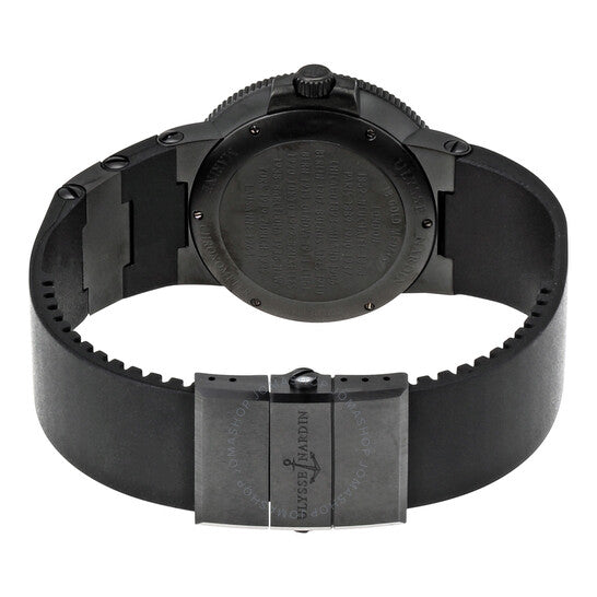 Black dlc stainless steel case with a black rubber (with ceramic elements) strap. Fixed black dlc stainless steel bezel. Black carbon fiber dial with black-tone hands and Roman numeral hour markers. Minute markers around the outer rim. Dial Type: Analog. Luminescent hands and markers. Date display at the 6 o'clock position. Two sub-dials displaying: small second and power reserve indicator. Ulysse Nardin Calibre UN-26 Automatic movement, containing 28 Jewels, bitting at 28800 vph, and has a power reserve of approximately 42 hours. Scratch resistant sapphire crystal. Screw down crown. Solid case back. Round case shape, case size: 41 mm, case thickness: 12.5 mm. Band width: 24 mm. Fold over with push button release clasp. Water resistant at 200 meters / 660 feet. Functions: date, hour, minute, second, power reserve indicator, chronometer. Additional Info: limited edition. Maxi Marine Chronometer Series. Luxury watch style. Watch label: Swiss Made. Ulysse Nardin Maxi Marine Chronometer Automatic Men's Watch 263-66LE-3C-42-BLK.