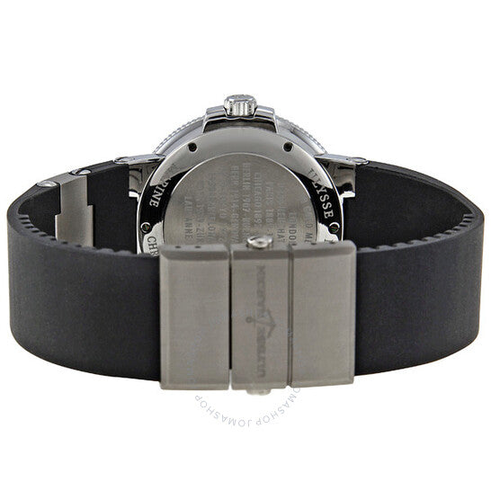 Stainless steel case with a black rubber strap with titanium inserts. Fixed stainless steel bezel. Silver dial with black hands and Arabic numeral hour markers. Minute markers around the outer rim. Dial Type: Analog. Luminescent hands and markers. Date display at the 6 o'clock position. Two sub-dials displaying: seconds and power reserve. Automatic movement. Scratch resistant sapphire crystal. Screw down crown. Case diameter: 41. mm. Case thickness: 11.8 mm. Round case shape. Band length: 8 inches. Fold over clasp with safety release. Water resistant at 200 meters / 660 feet. Casual watch style. Ulysse Nardin Maxi Marine Chronometer Men's Watch 263-66-3.