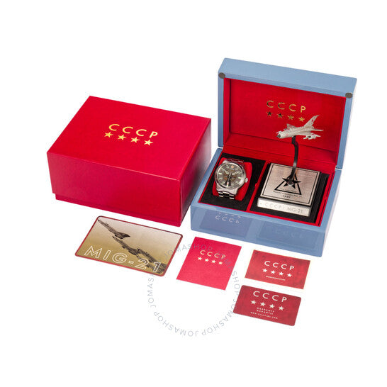 Silver-tone stainless steel case and bracelet. Fixed black stainless steel bezel. Grey dial with silver-tone hands and Arabic numeral & index hour markers. Minute markers around the outer rim. Dial Type: Analog. Luminescent hands and markers. Date display at the 6 o'clock position. Automatic movement. Scratch resistant mineral crystal. Transparent case back. Round case shape, case size: 48 mm, case thickness: 15 mm. Band width: 24 mm, band length: 8 inches. Fold over clasp with a safety release. Functions: date, hour, minute, second. Mig-21 Series. Fashion watch style. CCCP Mig-21 Automatic Grey Dial Men's Watch CP-7101-33.
