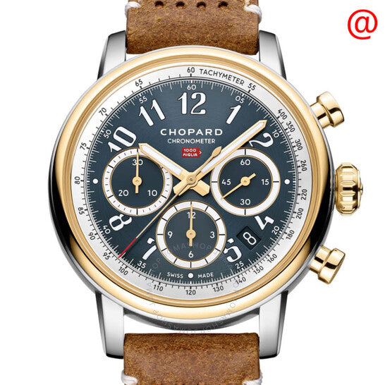 Silver-tone stainless steel case with a brown leather strap. Fixed yellow gold-tone 18kt yellow gold bezel. Blue dial with yellow gold-tone hands and Arabic numeral hour markers. Minute markers around the outer rim. Dial Type: Analog. Luminescent hands and markers. Date display between 4 and 5 o'clock position. Automatic movement. Scratch resistant sapphire crystal. Screw down crown. Transparent see through case back. Round case shape, case size: 40 mm. Buckle clasp. Water resistant at 50 meters / 165 feet. Functions: chronograph, date, hour, minute, second. Additional Info: original box, manual (complete accessories). Mille Miglia Series. Luxury watch style. Watch label: Swiss Made. Chopard Mille Miglia Chronograph Automatic Blue Dial Men's Watch 168619-4001.