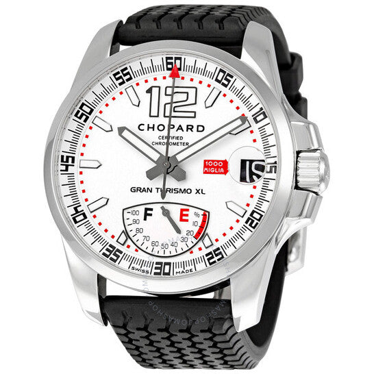 Stainless steel case with a black rubber strap. Fixed stainless steel bezel. White dial with luminous hands and index hour markers. Arabic numeral at the 12 o'clock position. Minute markers around the outer rim. Dial Type: Analog. Luminescent hands and markers. Date displays at the 3 o'clock position. Power reserve sub-dial at the 6 o'clock position. Automatic movement with a 46 hyour power reserve. Scratch resistant sapphire crystal. Screw down crown. Skeleton case back. Case diameter: 44 mm. Case thickness: 14.5 mm. Round case shape. Band width: 23 mm. Band length: 8.5 inches. Deployment clasp. Water resistant at 100 meters / 330 feet. Functions: hours, minutes, seconds, calendar. Dress watch style. Watch label: Swiss Made. Chopard Mille Miglia Gran Turismo XL Men's Watch 16/8457-3002.