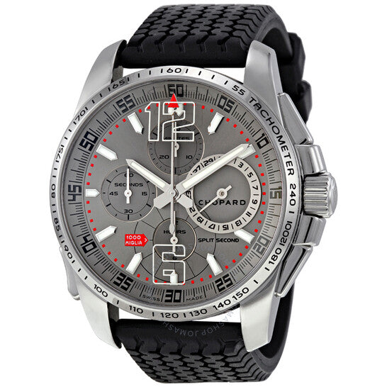 Stainless steel case with a black rubber strap with Dunlop tread. Fixed stainless steel bezel with tachymeter. Gray dial with silver-tone hands and index hour markers. Arabic numerals mark the 6 and 12 o'clock positions. Minute markers around the outer rim. Dial Type: Analog. Luminescent hands and markers. Chronograph - four sub-dials displaying: 60 second, 30 minute, 12 hour and date. Automatic movement. Scratch resistant anti-reflective sapphire crystal. Stainless steel crown with Miglia logo. Transparent case back. Case diameter: 44 mm. Case thickness: 15.6 mm. Band width: 22.5mm. Deployment clasp with push button release (chopard logo). Water resistant at 50 meters / 165 feet. Functions: chronograph, date, hour, minute, second. Luxury watch style. Watch label: Swiss Made. Chopard Mille Miglia Limited Edition Split Second Men's Watch 168513-3001.