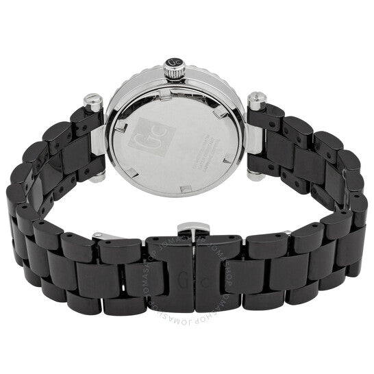 Stainless steel case with a black ceramic bracelet. Fixed stainless steel bezel with an inlaid black ceramic ring. Black dial with silver-tone hands and alternating Roman numeral and index hour markers. Dial Type: Analog. Quartz movement. Scratch resistant sapphire crystal. Pull / push crown. Solid case back. Round case shape. Case size: 28 mm. Case thickness: 9 mm. Band width: 14 mm. Fold over clasp with a push button release. Water resistant at 100 meters / 330 feet. Functions: hour, minute, second. Mini Chic Ceramic Series. Casual watch style. Watch label: Swiss Made. GC by Guess Mini Chic Ceramic Quartz Black Dial Ladies Watch X70012L2S.
