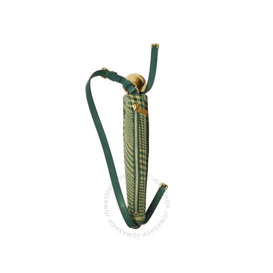 Burberry Ladies Shoulder Bag. SKU: 8082579. Color: Ivy. Size: 10.2 x 2.2 x 5.3in. Burberry Mini Shield Houndstooth Sling Bag. Crafted in Italy from a cotton blend featuring a seasonal warped houndstooth pattern, this compact shoulder bag is trimmed and lined with smooth leather, shaped like a folded shield, and finished with a detachable bell charm. Outer: 95% cotton, 4% elastane, 1% polyamide. Trim: 100% lambskin. Made in Italy.