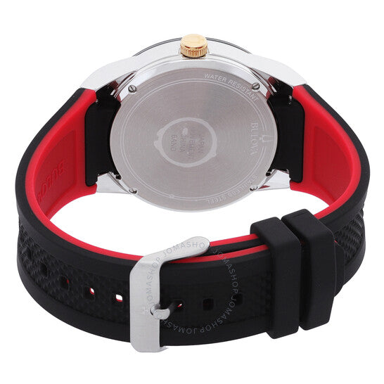 Silver-tone stainless steel case with a black silicone strap. Fixed black stainless steel bezel. Black dial with gold-tone hands and index hour markers. Minute markers around the outer rim. Dial Type: Analog. Luminescent hands. Quartz movement. Scratch resistant mineral crystal. Pull / push crown. Solid case back. Round case shape, case size: 41 mm. Tang clasp. Water resistant at 30 meters / 100 feet. Functions: chronograph, day, hour, minute, second. Modern Millenia Series. Sport watch style. Bulova Modern Millenia Chronograph Quartz Black Dial Men's Watch 98C146.