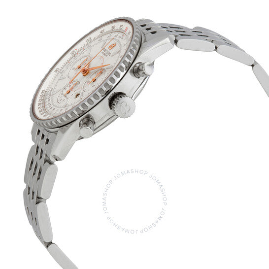 Silver-tone stainless steel case and bracelet. Bi-directional rotating slide rule silver-tone stainless steel bezel. Silver dial with silver tone hands and silver tone stick hour markers. Slide rule markers around the outer rim. Dial Type: Analog. Date display between 4 and 5 o'clock position. Chronograph - two sub-dials displaying: 60 second and 30 minute. Breitling Calibre 41 Automatic movement, based upon ETA 2892-A2, containing 38 Jewels, bitting at 28800 vph, and has a power reserve of approximately 42 hours. Scratch resistant mineral crystal. Round case shape, case size: 38 mm, case thickness: 13 mm. Band width: 20-18 mm, band length: 8.5 inches. Deployment clasp. Water resistant at 30 meters / 100 feet. Functions: chronograph, date, hour, minute, second, nautical miles conversion scale. Additional Info: chronograph, date display between 4 and 5 o'clock. Montbrilliant Series. Sport watch style. Item Variations: A4137012. Breitling Montbrilliant Chronograph Automatic Silver Dial Men's Watch A4137012-G634-444A.