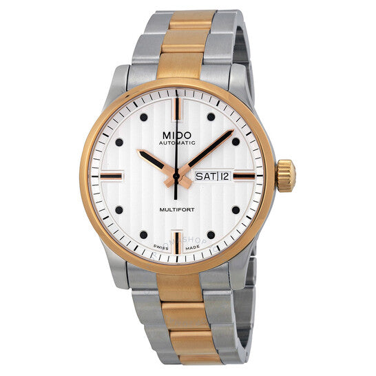 Stainless steel case with a two-tone (silver and gold-plated) stainless steel bracelet. Fixed- gold-plated bezel. Silver dial with rose gold-tone hands and dot hour markers. Minute markers around the outer rim. Dial Type: Analog. Day of the week and date display at the 3 o'clock position. Mido Calibre 80.621 automatic movement with about 80 hours of power reserve. Scratch resistant sapphire crystal. Skeleton case back. Case size: 42 mm. Case thickness: 10 mm. Round case shape. Band width: 22 mm. Deployment clasp. Water resistant at 100 meters / 330 feet. Item Variations: M005 430 22 031 02, M005-430-22-031-02, M005/430/22/031/02, M0054302203102. Functions: date, day, hour, minute, second. Casual watch style. Watch label: Swiss Made. Mido Multifort Automatic Men's Watch M005.430.22.031.02.