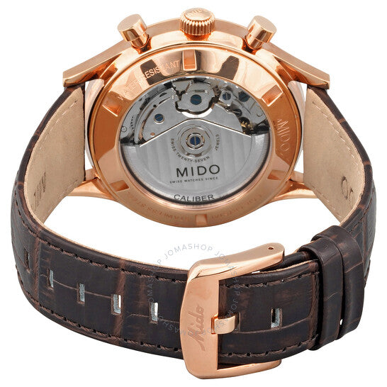 Rose gold-tone stainless steel case with a brown leather strap. Fixed rose gold-tone stainless steel bezel. Blue dial with rose gold-tone hands and Arabic numeral hour markers. Minute markers around the outer rim. Dial Type: Analog. Luminescent hands. Date display at the 6 o'clock position. Chronograph - two sub-dials displaying: 60 second and 30 minute. Caliber 60 automatic movement with a 60 power reserve. Scratch resistant sapphire crystal. Transparent see through case back. Round case shape, case size: 42 mm, case thickness: 15.2 mm. Band width: 21 mm. Buckle clasp. Water resistant at 50 meters / 165 feet. Functions: chronograph, date, hour, minute, second. Multifort Series. Casual watch style. Watch label: Swiss Made. Mido Multifort Chronograph Automatic Blue Dial Men's Watch M0404273604200.