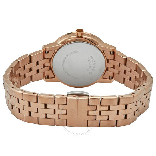 Rose gold PVD stainless steel case and bracelet. Fixed rose gold PVD bezel. Blue mother of pearl dial with rose gold-tone hands. No markers. THe Movado dot appears at the 12 o'clock position. Dial Type: Analog. Quartz movement. Scratch resistant mineral crystal. Pull / push crown. Solid case back. Round case shape. Case size: 28 mm. Band width: 18 mm. Butterfly clasp. Water resistant at 30 meters / 100 feet. Functions: hour, minute. Casual watch style. Watch label: Swiss Made. Movado Museum Quartz Blue Mother of Pearl Dial Ladies Watch 0607354.