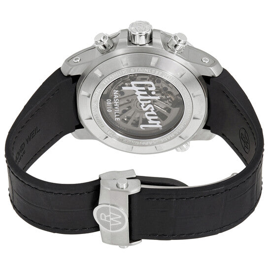 Titanium case with a black rubber strap. Fixed black ceramic bezel showing tachymeter markings. Black dial with luminous silver-tone hands and index hour markers. Minute markers around the outer rim. Dial Type: Analog. Luminescent hands. Date display between the 4 and 5 o'clock positions. Chronograph - three sub-dials displaying: 60 second, 30 minute and 12 hours. Automatic movement with a 46-hour power reserve. Scratch resistant sapphire crystal. Screw down crown. Transparent case back. Case size: 46 mm. Case thickness: 15.25 mm. Round case shape. Band width: 20 mm. Deployment clasp. Water resistant at 200 meters / 660 feet. Functions: chronograph, date, hour, minute, second. Additional Info: special edition inspired by Gibson. In general, suitable for professional marine activity and serious surface water sports, but not diving. Sport watch style. Watch label: Swiss Made. Item Variations: 7850 TIR GIBS1, 7850.TIR.GIBS1, 7850TIRGIBS1. Raymond Weil Nabucco Special Edition Chronograph Automatic Men's Watch 7850-TIR-GIBS1.