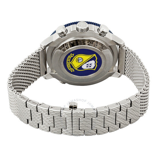 Stainless steel case with a mesh stainless steel bracelet. Navy blue dial with yellow-tone hands and index hour markers. Dial Type: Analog-digital. Luminescent hands and markers. Four sub-dials displaying: charge indicator, dual time, 24 hour and functions indicator. Citizen caliber Eco-Drive U680 quartz movement. Scratch resistant mineral crystal. Screw down crown. Case size: 48 mm. Case thickness: 15 mm. Round case shape. Band width: 23 mm. Deployment clasp with a push button release. Water resistant at 200 meters / 660 feet. Functions: hour, minute, second, chronograph, countdown timer, world timer, alarms, battery charge indicator, perpetual calendar. Sport watch style. Citizen Navihawk A-T Chronograph Perpetual Men's Watch JY8031-56L.