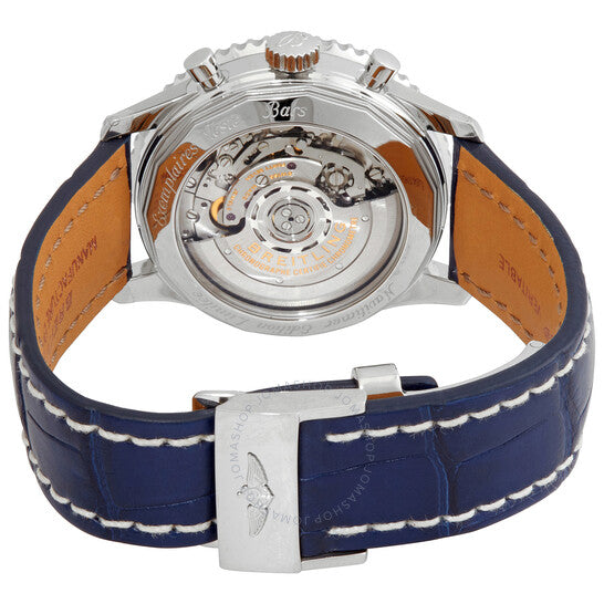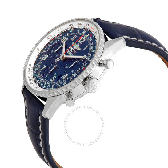 Silver-tone polished stainless steel case with a blue leather strap. Bi-directional rotating silver-tone bezel. Blue dial with silver-tone hands and Arabic numeral hour markers. Dial Type: Analog. Luminescent hands and markers. Date display between 4 and 5 o'clock position. Chronograph - three sub-dials displaying: 60 second, 30 minute and 12 hours. Breitling Calibre 01 Automatic movement, containing 47 Jewels, composed of 346 parts, bitting at 28800 vph, and has a power reserve of approximately 70 hours. Scratch resistant sapphire crystal. Pull / push crown. Round case shape, case size: 43 mm, case thickness: 14.25 mm. Deployment clasp. Water resistant at 30 meters / 100 feet. Functions: chronograph, date, hour, minute, second, slide rule feature,. Additional Info: limited edition of 1000 pieces. Navitimer 01 Series. Luxury watch style. Watch label: Swiss Made. Breitling Navitimer 01 Chronograph Automatic Blue Dial Men's Watch AB0121C4/C920.732P.A20D.1.