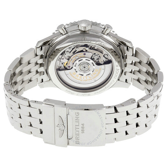 Silver-tone stainless steel case with a silver-tone stainless steel bracelet. Bi-directional rotating slide rule silver-tone and blue stainless steel bezel. Black dial with silver-tone hands and index hour markers. Slide rule aka "navigation computer" around the outer rim. Dial Type: Analog. Luminescent hands and markers. Date display between 4 and 5 o'clock position. Chronograph - three sub-dials displaying: 60 second, 30 minute and 12 hour. Breitling Calibre 01 automatic movement with a 70-hour power reserve. Scratch resistant sapphire crystal. Pull / push crown. Solid case back. Round case shape, case size: 43 mm, case thickness: 14.25 mm. Band width: 22-20 mm. Deployment clasp. Water resistant at 30 meters / 100 feet. Functions: chronograph, chronometer, date, hour, minute, second. Additional Info: limited blue edition of 1000 pieces. Luxury watch style. Watch label: Swiss Made. Breitling Navitimer 01 Limited Blue Edition Men's Watch AB012116/BE09SS.