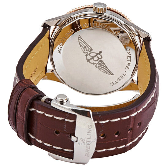 Stainless steel case with a brown (alligator) leather strap. Bi-directional rotating 18kt rose gold bezel. Silver dial with luminous rose gold-tone hands and index hour markers. Minute markers. Tachymeter markers around the outer rim. Dial Type: Analog. Luminescent hands and markers. Date display at the 6 o'clock position. Breitling calibre 17 automatic movement, based upon ETA 2824-2, containing 25 Jewels, bitting at 28800 vph, and has a power reserve of approximately 42 hours. Scratch resistant sapphire crystal. Pull / push crown. Solid case back. Round case shape. Case size: 41 mm. Case thickness: 10 mm. Band width: 22 mm / 20 mm. Fold over clasp. Water resistant at 30 meters / 100 feet. Functions: date, hour, minute, second. Navitimer 1 Series. Luxury watch style. Watch label: Swiss Made. Breitling Navitimer 1 Automatic Silver Dial Men's Watch U17326211G1P2.