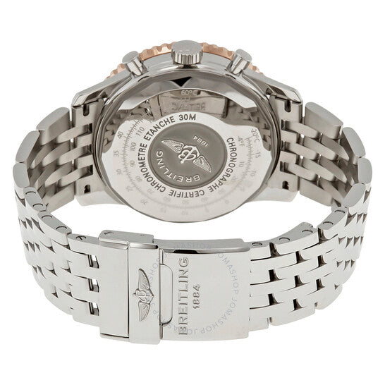 Stainless steel case with a stainless steel bracelet. Bi-directional rotating 18kt rose gold bezel. Black dial with luminous rose gold-tone hands and index hour markers. Minute markers. Slide rule markings around the outer rim. Dial Type: Analog. Luminescent hands and markers. Date display at the 3 o'clock position. Chronograph - three sub-dials displaying: 60 seconds, 30 minutes, and 12 hours. Breitling Calibre 13 Automatic movement, based upon ETA Valjoux 7750, containing 25 Jewels, bitting at 28800 vph, and has a power reserve of approximately 42 hours. Scratch resistant sapphire crystal. Pull / push crown. Transparent case back. Round case shape. Case size: 41 mm. Case thickness: 14.44 mm. Band width: 22 mm. Band length: 7 inches. Fold over clasp with a safety release. Water resistant at 30 meters / 100 feet. Functions: chronograph, date, hour, minute, second, chronometer. Luxury watch style. Watch label: Swiss Made. Item Variations: U1332421-BG73-451A. Additional Information: The Slide-Rule aka Navigation-Computer complication computes airborne calculations such as fuel consumption, climbing times & converts miles into nautical miles or kilometers. Breitling Navitimer 1 Chronograph Automatic Black Dial Men's Watch U13324211B1A1.