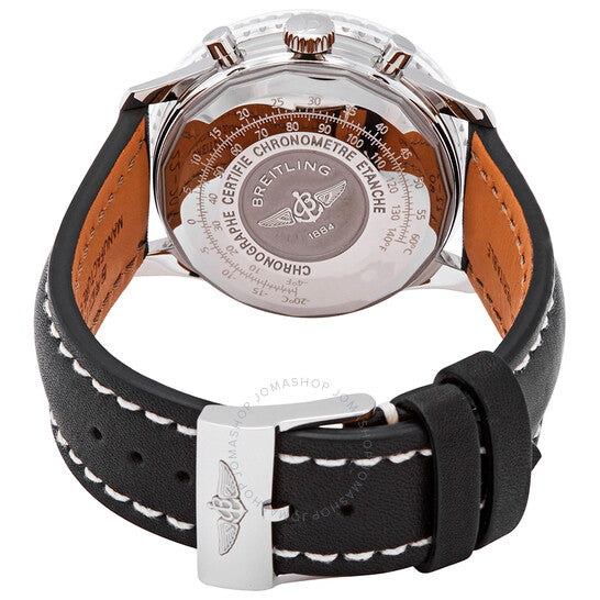 Stainless steel case with a black leather strap. Bi-directional rotating stainless steel bezel. Blue dial with luminous silver-tone hands and index hour markers. Minute markers. Slide rule markings around the outer rim. Dial Type: Analog. Luminescent hands and markers. Date display at the 3 o'clock position. Chronograph - three sub-dials displaying: 60 second, 30 minute and 12 hour. Breitling calibre 13 automatic movement, based upon ETA Valjoux 7750, containing 25 Jewels, bitting at 28800 vph, and has a power reserve of approximately 42 hours. Scratch resistant sapphire crystal. Pull / push crown. Transparent case back. Round case shape. Case size: 41 mm. Case thickness: 14.44 mm. Band width: 22 mm. Band length: 7 inches. Tang clasp. Water resistant at 30 meters / 100 feet. Functions: chronograph, date, hour, minute, second, chronometer. Navitimer 1 Series. Luxury watch style. Watch label: Swiss Made. Item Variations: A1332412-CA02-435X-A20BA.1. Additional Information: The Slide-Rule aka Navigation-Computer complication computes airborne calculations such as fuel consumption, climbing times & converts miles into nautical miles or kilometers.. Breitling Navitimer 1 Chronograph Automatic Blue Dial Men's Watch A13324121C1X1.