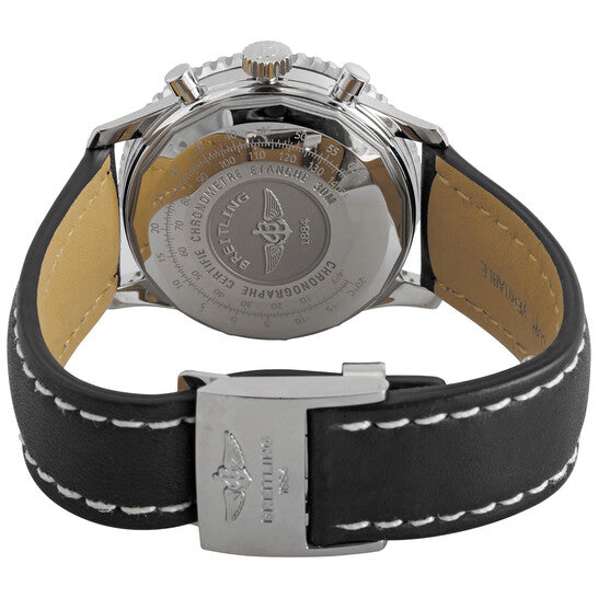 Stainless steel case with a black (calfskin) leather strap. Bi-directional rotating stainless steel bezel. Blue dial with luminous silver-tone hands and index hour markers. Minute markers, Slide rule markings around the outer rim. Dial Type: Analog. Luminescent hands and markers. Date display at the 3 o'clock position. Chronograph - three sub-dials displaying: 60 seconds, 30 minutes, and 12 hours. Breitling calibre 13 automatic movement with a 42-hour power reserve. Scratch resistant sapphire crystal. Pull / push crown. Solid case back. Round case shape. Case size: 41 mm. Case thickness: 14.44 mm. Band width: 22 mm. Fold over clasp. Water resistant at 30 meters / 100 feet. Functions: chronograph, date, hour, minute, second, chronometer. Luxury watch style. Watch label: Swiss Made. Additional Information: The Slide-Rule aka Navigation-Computer complication computes airborne calculations such as fuel consumption, climbing times and converts miles into nautical miles or kilometers. Breitling Navitimer 1 Chronograph Automatic Blue Dial Men's Watch A13324121C1X2.