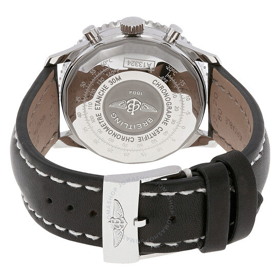 Stainless steel case with a black leather strap. Bi-directional rotating stainless steel bezel. Silver dial with luminous rose gold-tone hands and index hour markers. Minute markers. Slide rule markings around the outer rim. Dial Type: Analog. Luminescent hands and markers. Date display at the 3 o'clock position. Chronograph - three sub-dials displaying: 60 second, 30 minute and 12 hour. Breitling calibre 13 automatic movement, based upon ETA Valjoux 7750, containing 25 Jewels, bitting at 28800 vph, and has a power reserve of approximately 42 hours. Scratch resistant sapphire crystal. Pull / push crown. Transparent case back. Round case shape. Case size: 41 mm. Case thickness: 14.44 mm. Band width: 22 mm. Band length: 7 inches. Tang clasp. Water resistant at 30 meters / 100 feet. Functions: chronograph, date, hour, minute, second, chronometer. Navitimer 1 Series. Luxury watch style. Watch label: Swiss Made. Item Variations: A1332412-G834-435X-A20BA.1. Additional Information: The Slide-Rule aka Navigation-Computer complication computes airborne calculations such as fuel consumption, climbing times & converts miles into nautical miles or kilometers. Breitling Navitimer 1 Chronograph Automatic Silver Dial Men's Watch A13324121G1X2.