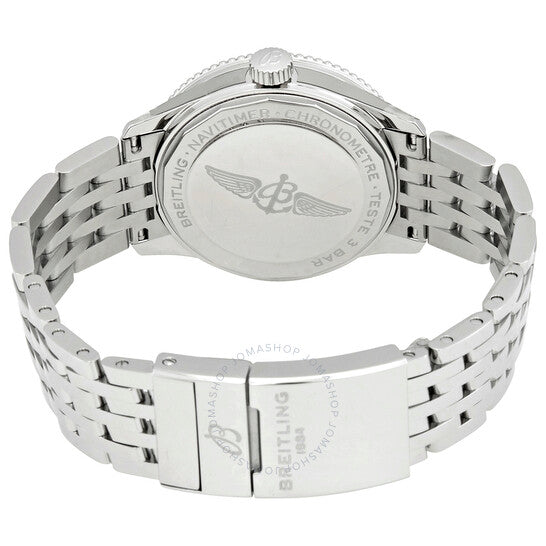 Silver-tone stainless steel case and bracelet. Bi-directional rotating silver-tone stainless steel bezel. Blue dial with silver-tone hands and index hour markers. Tachymeter markers around the outer rim. Dial Type: Analog. Luminescent hands and markers. Breitling Calibre 17 Automatic movement, based upon ETA 2824-2, containing 25 Jewels, bitting at 28800 vph, and has a power reserve of approximately 42 hours. Scratch resistant sapphire crystal. Pull / push crown. Solid case back. Round case shape, case size: 35 mm, case thickness: 9.92 mm. Band width: 18/16 mm. Fold over clasp with a safety release. Water resistant at 30 meters / 100 feet. Functions: hour, minute, second, tachymeter. Navitimer 35 Series. Luxury watch style. Watch label: Swiss Made. Breitling Navitimer 35 Automatic Blue Dial Ladies Watch A17395161C1A1.
