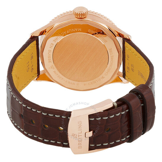 Rose gold-tone 18kt rose gold case with a brown leather strap. Bi-directional Rotating rose gold-tone 18kt rose gold bezel. Mother of pearl dial with rose gold-tone hands and diamond hour markers. Minute scale around the inner rim. Dial Type: Analog. Luminescent hands. Breitling Calibre 17 Automatic movement, based upon ETA 2824-2, containing 25 Jewels, bitting at 28800 vph, and has a power reserve of approximately 42 hours. Scratch resistant sapphire crystal. Solid case back. Round case shape, case size: 36 mm, case thickness: 11.4 mm. Band width: 18 mm. Tang clasp. Water resistant at 30 meters / 100 feet. Functions: hour, minute, second. Navitimer Series. Dress watch style. Watch label: Swiss Made. Breitling Navitimer Automatic Diamond Ladies Watch R17327211A1P1.
