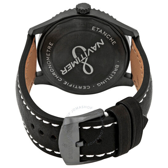Black stainless steel case with a black leather strap. Bi-directional rotating black stainless steel bezel. Black dial with luminous silver-tone hands and Arabic numeral hour markers. Minute markers around the outer rim. Dial Type: Analog. Luminescent hands and markers. Date display at the 6 o'clock position. Breitling calibre 17 automatic movement with a 42-hour power reserve. Scratch resistant sapphire crystal. Screw locked crown. Solid case back. Round case shape. Case size: 41 mm. Case thickness: 10.74 mm. Band width: 21 mm. Tang clasp. Water resistant at 100 meters / 330 feet. Functions: date, hour, minute, second, chronometer. Luxury watch style. Watch label: Swiss Made. Breitling Navitimer 8 Automatic Chronometer Black Dial Men's Watch M17314101B1X1.