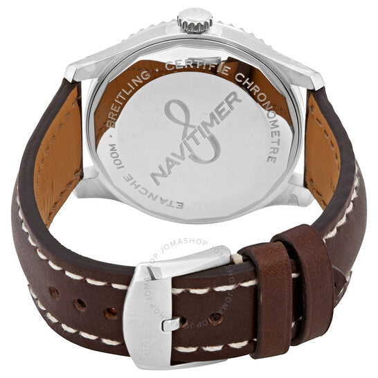 Stainless steel case with a brown leather strap. Bi-directional rotating stainless steel bezel. Blue dial with luminous silver-tone hands and Arabic numeral hour markers. Minute markers around the outer rim. Dial Type: Analog. Luminescent hands and markers. Date display at the 6 o'clock position. Breitling calibre 17 automatic movement, based upon ETA 2824-2, containing 25 Jewels, bitting at 28800 vph, and has a power reserve of approximately 42 hours. Scratch resistant sapphire crystal. Screw locked crown. Solid case back. Round case shape. Case size: 41 mm. Case thickness: 10.74 mm. Band width: 21 mm. Tang clasp. Water resistant at 100 meters / 330 feet. Functions: date, hour, minute, second, chronometer. Luxury watch style. Watch label: Swiss Made. Item Variations: A1731410-C998-490X-A18BASA.6. Breitling Navitimer 8 Automatic Chronometer Blue Dial Men's Watch A17314101C1X1.