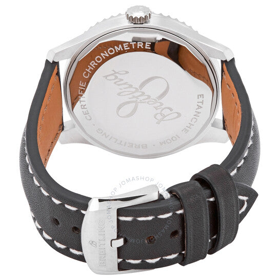 Stainless steel case with a black leather strap. Bi-directional rotating coin edge stainless steel bezel. Blue dial with luminous silver-tone hands and Arabic numeral hour markers. Arabic numeral minute markers (at 5 minute intervals). Minute markers around the outer rim. Dial Type: Analog. Luminescent hands and markers. Date display at the 6 o'clock position. Day of the week dispay centered on the 12 o'clopck position. Breitling calibre 45 automatic movement, based upon ETA 2834-2, containing 25 Jewels, bitting at 28800 vph, and has a power reserve of approximately 42 hours. Scratch resistant sapphire crystal. Screw locked crown. Solid case back. Round case shape. Case size: 41 mm. Case thickness: 11.19 mm. Band width: 21 mm. Tang clasp. Water resistant at 100 meters / 330 feet. Functions: date, day, hour, minute, second, chronometer. Navitimer 8 Series. Luxury watch style. Watch label: Swiss Made. Item Variations: A4533010-CA10-493X-A18BASA.6. Breitling Navitimer 8 Automatic Chronometer Blue Dial Men's Watch A45330101C1X1.