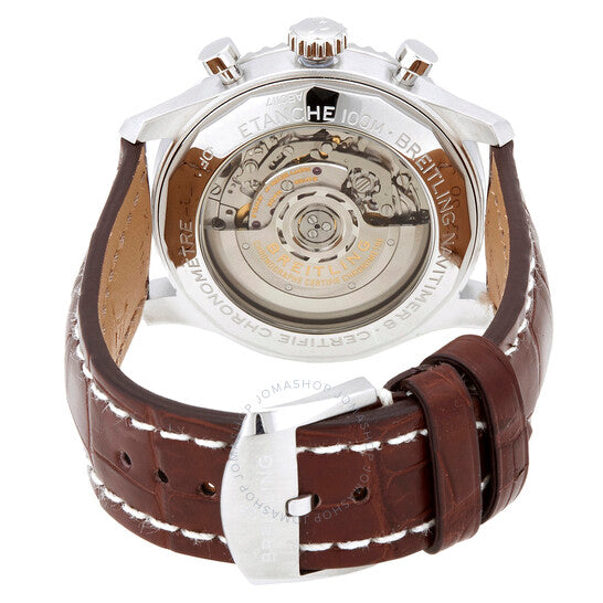 Stainless steel case with a brown (crocodile) leather strap. Bi-directional rotating stainless steel bezel. Silver dial with luminous silver-tone hands and Arabic numeral hour markers. Minute markers around the outer rim. Dial Type: Analog. Luminescent hands and markers. Date display between 4 and 5 o'clock position. Chronograph - three black sub-dials displaying: 60 second, 30 minute and 12 hour. Breitling calibre 01 automatic movement, containing 47 Jewels, composed of 346 parts, bitting at 28800 vph, and has a power reserve of approximately 70 hours. Scratch resistant sapphire crystal. Screw locked crown. Transparent case back. Round case shape. Case size: 43 mm. Case thickness: 13.97 mm. Band width: 23 mm. Tang clasp. Water resistant at 100 meters / 330 feet. Functions: chronograph, date, hour, minute, second, chronometer. Luxury watch style. Watch label: Swiss Made. Breitling Navitimer 8 Chronograph Automatic Chronometer Silver Dial Men's Watch AB01171A1G1P1.