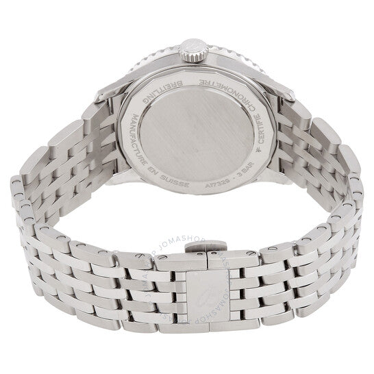 Silver-tone stainless steel case and bracelet. Silver-tone stainless steel bezel. Blue dial with silver-tone hands and index hour markers. Minute markers around the outer rim. Dial Type: Analog. Luminescent hands and markers. Breitling Calibre 17 Automatic movement, based upon ETA 2824-2, containing 25 Jewels, bitting at 28800 vph, and has a power reserve of approximately 42 hours. Scratch resistant sapphire crystal. Pull / push crown. Round case shape, case size: 41 mm. Fold over clasp with a safety release. Water resistant at 30 meters / 100 feet. Functions: hour, minute, second. Additional Info: original box, manual (complete accessories). Navitimer Series. Luxury watch style. Watch label: Swiss Made. Breitling Navitimer Automatic Blue Dial Men's Watch A17329171C1A1.