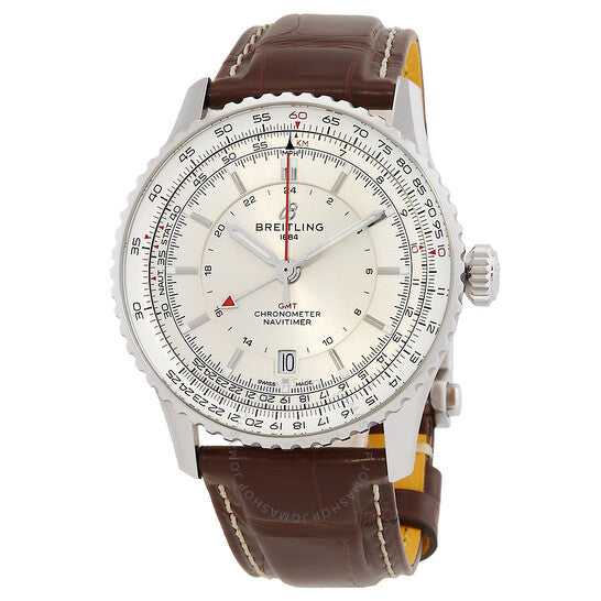 Silver-tone stainless steel case with a brown leather strap. Bi-directional rotating silver-tone stainless steel bezel. Beige dial with silver-tone hands and index hour markers. Dial Type: Analog. Luminescent hands and markers. Date display at the 6 o'clock position. Breitling Calibre 32 Automatic movement, based upon ETA 2893-2, containing 21 Jewels, bitting at 28800 vph, and has a power reserve of approximately 42 hours. Scratch resistant sapphire crystal. Solid case back. Round case shape, case size: 41 mm, case thickness: 11.6 mm. Band width: 22 mm. Folding clasp. Water resistant at 30 meters / 100 feet. Functions: date, hour, minute, second. Navitimer Series. Sport watch style. Watch label: Swiss Made. Breitling Navitimer Automatic Men's Watch A32310211G1P1.