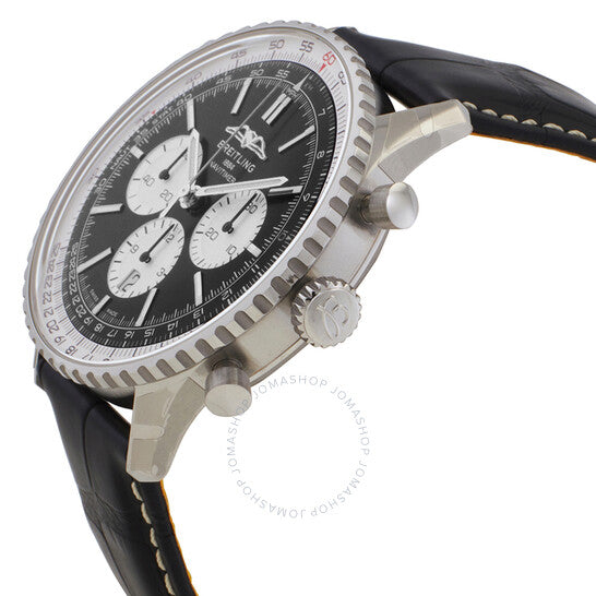 Stainless steel case with a black (alligator) leather strap. Bi-directional rotating stainless steel bezel. Black dial with luminous silver-tone hands and index hour markers. Minute markers. Slide rule markings around the outer rim. Dial Type: Analog. Date display above the 6 o'clock position. Chronograph - three sub-dials displaying: 60 second, 30 minute and 12 hours. Breitling 01 (Manufacture) automatic movement with a 70-hour power reserve. Scratch resistant sapphire crystal. Pull / push crown. Transparent case back. Round case shape. Case size: 46 mm. Case thickness: 13.9 mm. Band width: 24 mm / 20 mm. Fold over clasp. Water resistant at 30 meters / 100 feet. Functions: chronograph, slide rule date, hour, minute, second. Navitimer B01 Series. Luxury watch style. Watch label: Swiss Made. Breitling Navitimer B01 Chronograph Automatic Black Dial Men's Watch AB0137211B1P1.