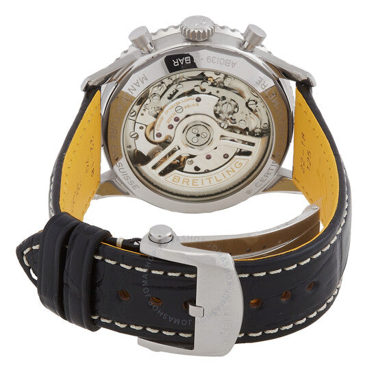 Silver-tone stainless steel case with a black alligator leather strap. Bi-directional rotating silver-tone stainless steel bezel. Black dial with silver-tone hands and index hour markers. Minute markers around the outer rim. Dial Type: Analog. Luminescent hands and markers. Date display at the 6 o'clock position. Chronograph - three sub-dials displaying: 60 second, 30 minute and 12 hour. Breitling Calibre 01 Automatic movement, containing 47 Jewels, composed of 346 parts, bitting at 28800 vph, and has a power reserve of approximately 70 hours. Scratch resistant sapphire crystal. Pull / push crown. Transparent case back. Round case shape, case size: 41 mm, case thickness: 13.6 mm. Band width: 22 mm. Folding clasp. Water resistant at 30 meters / 100 feet. Functions: chronograph, column wheel, date, hour, minute, second, chronometer. Navitimer B01 Series. Luxury watch style. Watch label: Swiss Made. Breitling Navitimer B01 Chronograph Automatic Black Dial Men's Watch AB0139211B1P1.